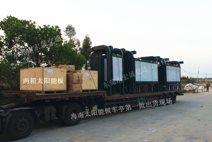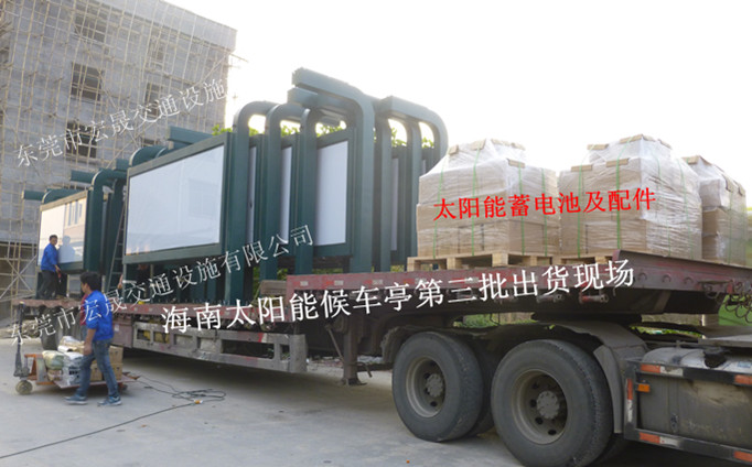 海南太陽能公交候車亭廠家裝車圖片及現(xiàn)場安裝的太陽能候車亭圖片: