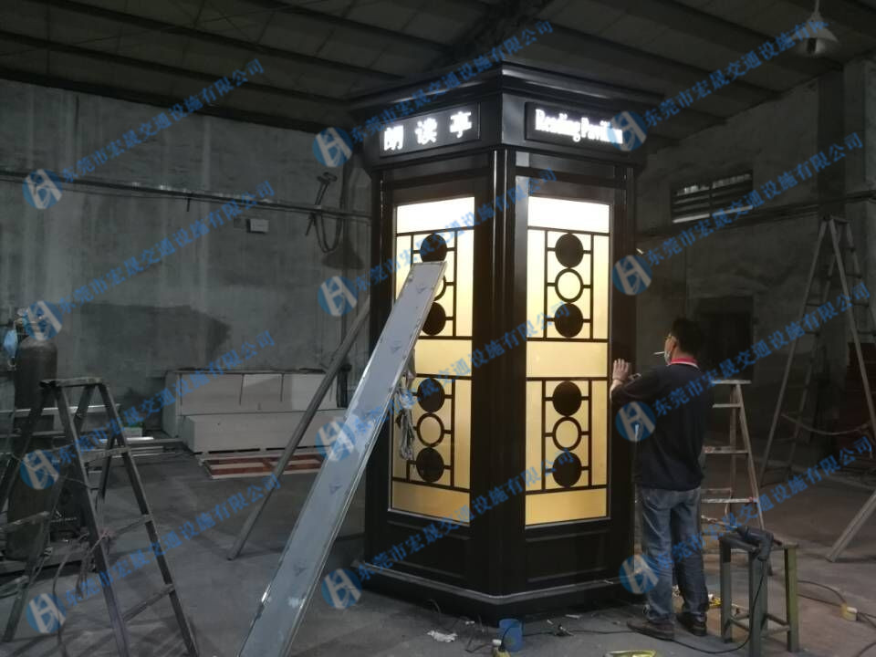 江蘇宿遷朗讀亭制作工藝說明:朗讀亭整個結(jié)構(gòu)采用鍍鋅鋼板制作,亭子五層結(jié)構(gòu),亭身采用雙面鋼化玻璃制作,單面透明鋼化玻璃,單面磨砂玻璃,內(nèi)飾墻板采用鍍鋅鋼板噴金色戶外氟碳漆,里面按照客戶要求空調(diào)插座及進(jìn)線孔、攝像頭孔、一體機(jī)預(yù)留位以及網(wǎng)線布局、配電箱、開關(guān)插座。