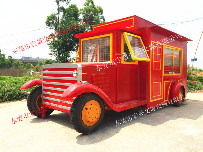 此款拖掛式移動(dòng)售貨亭按照老爺車的外形設(shè)計(jì),整體美觀、大方,再加上紅色的戶外氟碳漆,更是高端大氣,上檔次。